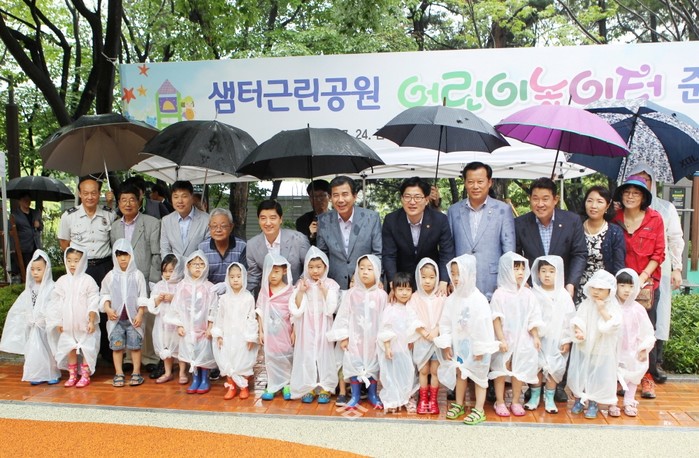 최근 서울 강동구 샘터근린공원 어린이 놀이터에서 열린 ‘샘터근린공원 어린이놀이시설 개선사업 준공식’에 참석한 성임제 의장(두번째줄 가운데)이 비가오는 가운데 아이들과 함께 기념촬영을 하고 있다.