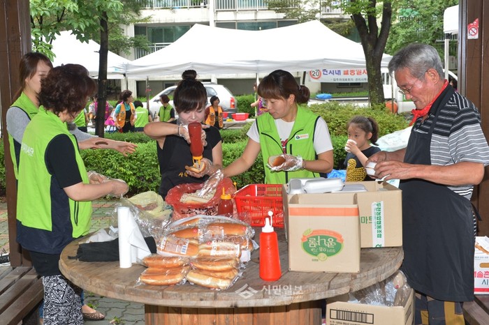 지난 25일 경기 동두천 부영아파트 1단지 경로당 방문을 위해 동두천시청 주민생활지원과, 동두천 무궁화라이온스클럽, 고려수지침 봉사단체가 노인들에게 제공할 핫도그를 만들고 있다.(사진제공=동두천시청)