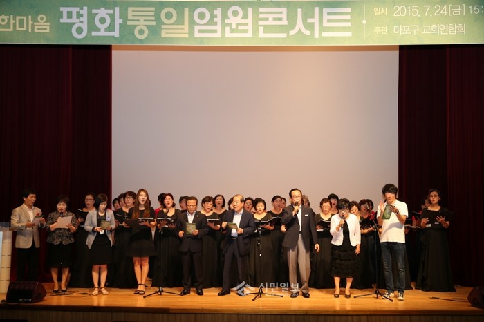 박홍섭 마포구청장(가운데)이 최근 구청 대강당에서 열린 '제1회 마포구민 한마음 평화통일염원 콘서트'에 참석해 모든 공연자들과 함께 '철마의 꿈'을 합창하고 있다. 이번 콘서트는 광복 70주년을 맞아 통일을 염원하는 마음을 담은 공연으로, 구민들과 통일의 공감대를 함께 나누고자 마포구 교회연합회가 주관한 행사다. (사진제공=마포구청)