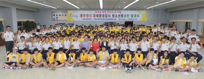 최근 경기 동두천시가 시청 대회의실에서 청소년보호법 위반행위 감시 등 건전한 청소년 사회를 만들기 위해 발족한 ‘2015 유해환경감시 청소년봉사단’ 참가자들이 발대식을 마치고 파이팅을 외치고 있다.(사진제공=동두천시청)