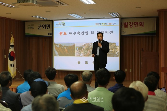 전남 완도군 군외면은 최근 신우철 군수를 초청해 주민들을 대상으로 특별강연회를 개최했다. 사진은 신 군수가 ‘완도 자연그대로 농축산업 및 수산물 우수성’을 주제로 강의를 펼치고 있는 모습.(사진제공=완도군청)