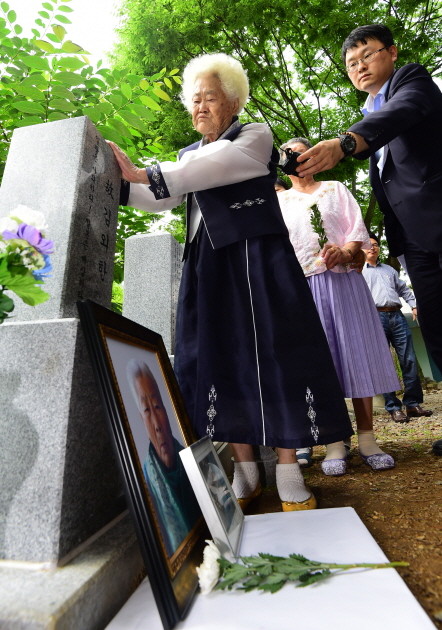 김외한 할머니 추모비 만지는 이옥선 할머니