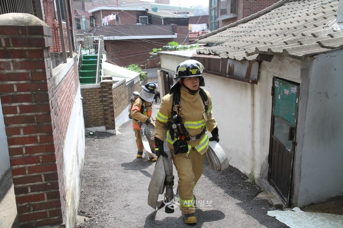 서울 동작소방서가 지난 28일 오후 2시 동작구 장승배기로9길 일대 주거 밀집지역의 소방차량 진입곤란 지역에 대한 '재난현장 중계방수훈련'을 실시했다. 사진은 소방대원들이 좁은 골목에서 소방 호스를 옮기며 훈련에 참여 중인 모습.(사진제공=동작소방서)