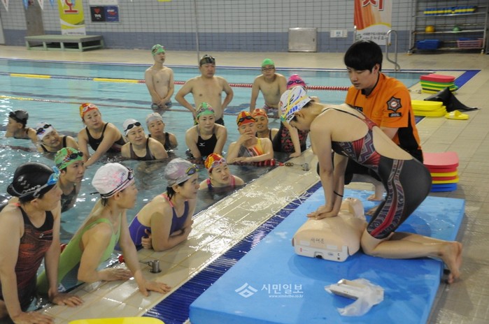 지난 28일 서울 서대문소방서가 서대문문화체육회관 수영장에서 '소방안전 교육'을 실시한 가운데 수영 강좌 수강생들이 심폐소생술 및 응급처치법을 배우고 있다. (사진제공=서대문소방서)