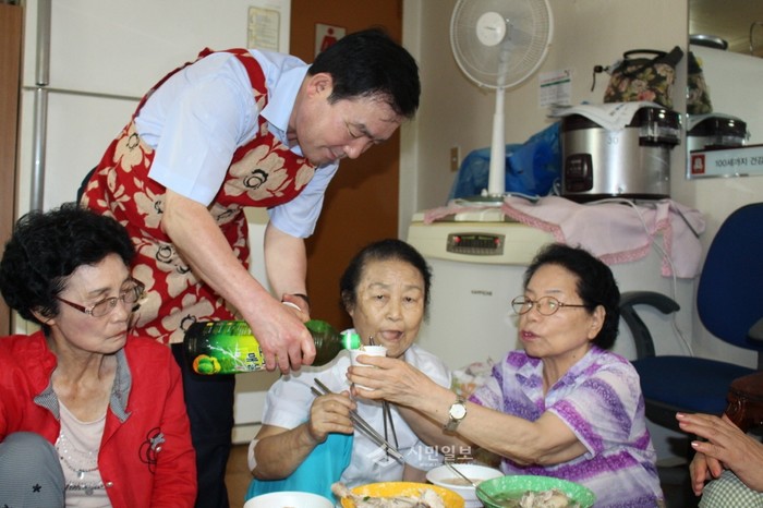지난 28일 서울 송파구 석촌동 일대 경로당에서 석촌·돌마리·오봉산 노인 200명을 대상으로 열린 '어르신 삼계탕 끓여 드리기' 행사에 참가한 임춘대 의장이 삼계탕 배식 봉사를 하며 노인들을 대접하고 있다.(사진제공=송파구의회)
