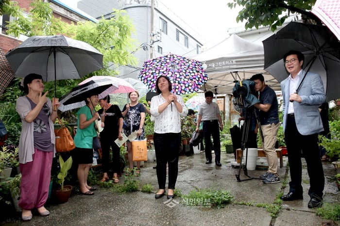 성동구가 최근 지역주민들과 함께 성수동 서울 숲길 일대를 탐방하는 '원오씨와 떠나는 마을 여행'을 진행했다. 사진은 서울그린트러스트 행사장을 방문한 정원오 구청장(오른쪽)과 성수동 주민들의 모습.(사진제공=성동구청)