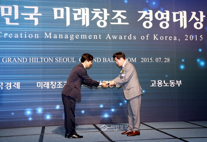 경기 용인시가 최근 '2015 대한민국 미래창조 경영대상'에서 기업가 정신 미래지향성 부문의 탁월성을 인정받아 대상을 받았다. 사진은 이날 시상식에서 정찬민 시장(오른쪽)이 대상을 받고 있는 모습.(사진제공=용인시청)