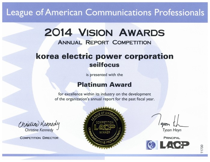 한국전력(사장 조환익)은 美 LACP가 주관한 ‘2014 Vision Awards 애뉴얼리포트 대회’에서 대상(Platinum Awards)을 수상했다.