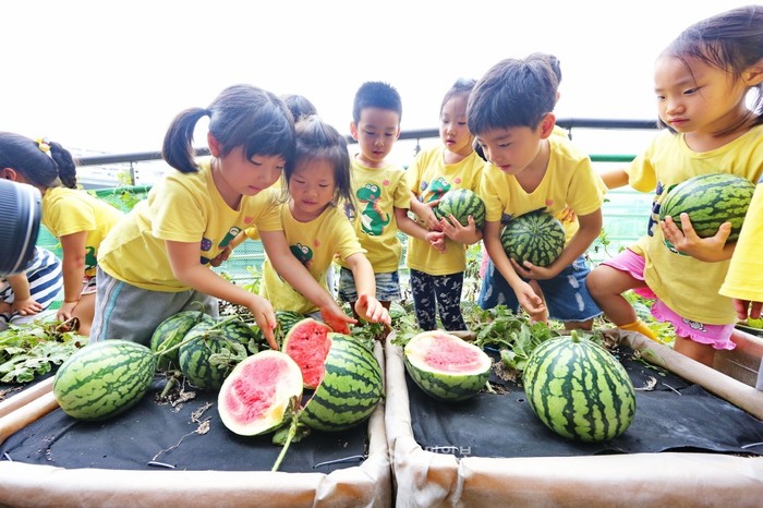금천구는 지난 29일 구청 옥상텃밭에서 꿈나래 어린이집 아이들과 학부모 30여명이 참여한 가운데 '수박따기 행사'를 개최했다. 사진은 행사에 참여한 아이들이 직접 딴 수박을 만지고 있는 모습.(사진제공=금천구청)