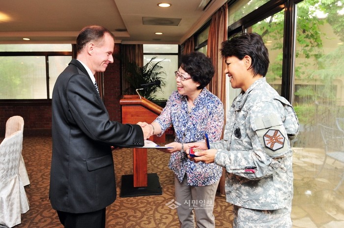 인천 부평구는 지난 29일 미8군 용산기지내 하텔하우스에서 '2015년 상반기 부평구한미친선협의회'가 개최됐다고 밝혔다. 사진은 이날 공동위원장인 홍미영 구청장(가운데)이 협의회 신규 위원에게 위촉식을 전달하며 악수하고 있는 모습.(사진제공=부평구청)