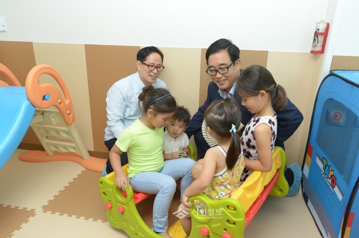 경기 양평군에 위치한 군인아파트 충정아파트에 지난 29일 군부대 자녀 돌봄 지원을 위한 '따복육아나눔터' 시설이 개관했다. 사진은 이날 개관식에 참석한 김선교 군수(오른쪽)가 육아나눔터를 찾은 어린이들과 함께 즐거운 시간을 보내고 있는 모습.(사진제공=양평군청)