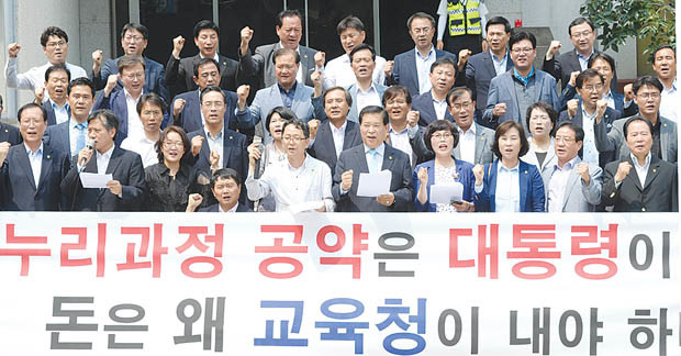 30일 오후 서울 중구 세종대로 서울시의회 앞에서 박래학 서울시의회 의장과 김문수 서울시의회 교육위 위원장 등 새정치민주연합 서울시의원들이 정부에 누리과정 예산 관련 국고 지원을 촉구하는 구호를 외치고 있다. 김문수 교육위원장은 “박근혜 대통령의 ‘0~5세 보육 및 교육 국가완전책임’ 공약으로 시행하는 누리과정의 재정부담을 국가책임이 아닌 각 시 ·도 교육청의 의무지출경비로 지정해 누리과정에 대한 모든 책임이 지방으로 전가되고 있다”고 밝혔다.