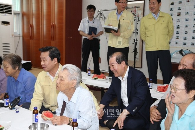 최근 박홍섭 서울 마포구청장과 박인용 국민안전처장관은 여름철 안전관리 현장점검의 일환으로 '무더위 쉼터'가 마련된 백합경로당을 방문했다. 사진은 노인들과 즐거운 담소를 나누고 있는 박 구청장(오른쪽에서 두 번째)과 박 장관(왼쪽에서 두 번째)의 모습.(사진제공=마포구청)