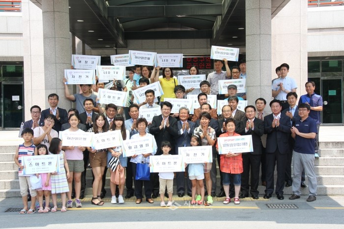 지난달 30일 충남 아산시 (사)아산시기업인협의회 주관 ‘놀러와 YOU! 아산! 스탬프 랠리’, 한국외식업중앙회아산시지부 주관 ‘외·회식사진 릴레이 이벤트’의 경품전달 행사에 참가한 복기왕 시장(중앙)과 당첨자들이 시청 앞에서 기념촬영을 하고 있다.(사진제공=아산시청)