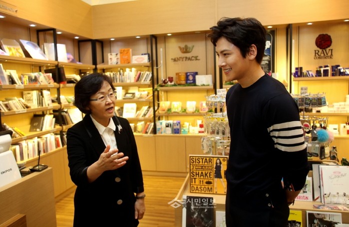 지난 1일 강남구 강남관광정보센터에서 열린 ‘한류스타 지창욱 팬사인회’에 참석한 신연희 구청장(왼쪽)이 한류스타 지창욱씨와 함께 팬사인회가 열리는 강남관광정보센터를 둘러보고 있다.(사진제공=강남구청)