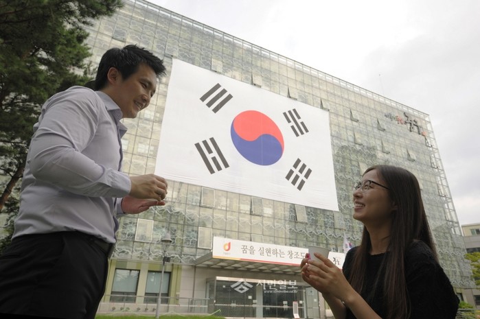 중구가 '광복 70주년'을 기념해 최근 구청사 외벽에 대형 태극기를 게시한 가운데 3일 태극기 앞에서 구청 직원들이 담소를 나누고 있다. 가로 21m·세로 14m 규격의 이 대형 태극기는 범국민적인 '나라사랑 태극기 달기 운동'에 적극 동참하고 광복절 경축 분위기 조성을 위해 오는 31일까지 게시될 예정이다. (사진제공=중구청)