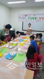 서울 강동구가 최근 여름방학을 맞아 건강관리 등 서비스가 필요한 드림스타트사업 사례관리 대상 아동을 대상으로 건강교육을 진행했다. 사진은 이날 교육에 참여한 어린이들이 교사의 지도에 따라 주먹밥을 만들고 있는 모습.(사진제공=강동구청)