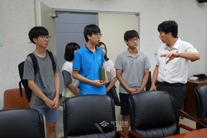 경기 화성시의회는 최근 동탄지역 고등학교 연합동아리 학생들을 대상으로 '2015년 청소년 의회체험 교실'을 진행했다. 사진은 이날 의회체험 교실에 참여한 학생들이 회의장을 찾아 최용주 의원(오른쪽)의 설명을 듣고 있는 모습.(사진제공=화성시의회)