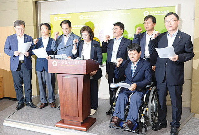 4일 오전 서울 중구 세종대로 서울특별시의회 기자실에서 열린 학교내 성범죄 근절 촉구 기자회견에서 김생환 서울특별시의회 인권특별위원회 위원장(오른쪽 세번째) 및 소속 위원들이 발언을 하며 구호를 외치고 있다. 이들은 서울의 한 공립고등학교에서 일어난 교사와 학생을 대상으로 성범죄 예방교육과 인권교육을 실시하고 성폭력 피해 실태를 조사하고 재발방지대책을 강구하라며 기자회견을 가졌다.
