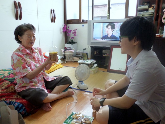서대문구 북아현동 주민센터는 최근 자원봉사 청소년들이 참여한 가운데 '시원한 세대 공감, 홀몸어르신 말벗 봉사활동'을 펼쳤다. 사진은 말벗봉사에 참여한 한 학생이 지역내 노인의 집을 방문해 음료수와 쿠키를 함께 나누며 이야기하고 있는 모습.(사진제공=서대문구청)