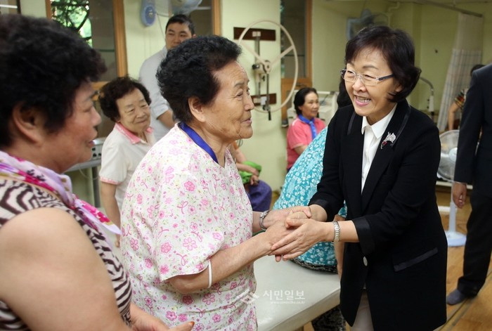 신연희 서울 강남구청장(오른쪽)이 최근 '어르신 무더위 쉼터'가 마련된 강남종합사회복지관을 방문해 노인들과 인사를 나누고 있다.(사진제공=강남구청)