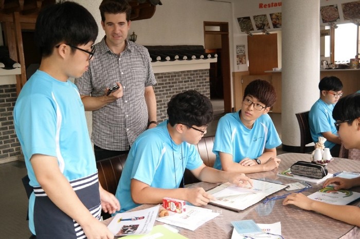 인천광역시교육연수원이 지난 3일 특성화고등학교 남학생들을 대상으로 'Global JOB School'의 첫 '여름 영어 캠프'를 실시했다. 사진은 캠프에 참여한 학생들이 원어민 교사와 함께 영어공부를 하고 있는 모습.(사진제공=인천시교육청)