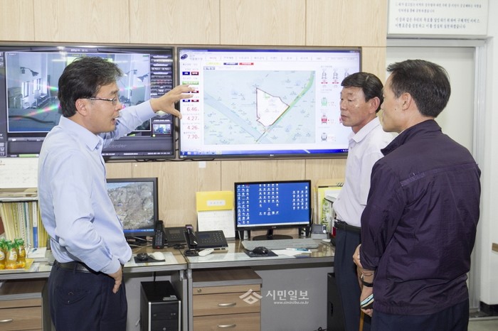 김우영 은평구청장은 최근 간부공무원들과 함께 구의 대표 침수예방 시설인 증산빗물펌프장을 방문해 현장점검을 실시했다. 사진은 김우영 구청장(왼쪽)이 펌프장 상황실에서 관계자들과 대화하는 모습.(사진제공=은평구청)