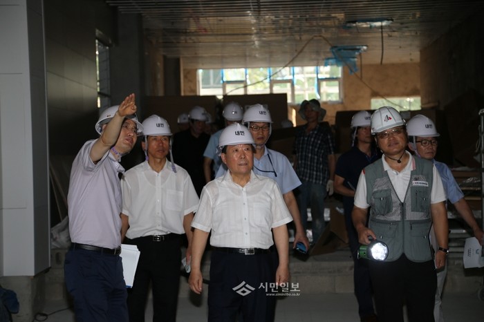 최근 박홍섭 서울 마포구청장(가운데)이 오는 10월 완공을 목표로 마포구 망원동에 건립 중인 구민체육센터 공사현장을 찾아 관계자들과 함께 현장을 둘러보고 있다. (사진제공=마포구청)