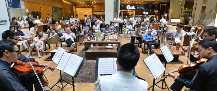 서울 광진구 건국대병원이 중동호흡기증후군(메르스) 극복과 힘찬 도약을 다짐하기 위해 3일 오후 피아노광장에서 '정오의 음악회'를 연 가운데 서울경찰악대원들이 연주를 선보이고 있다. /뉴시스