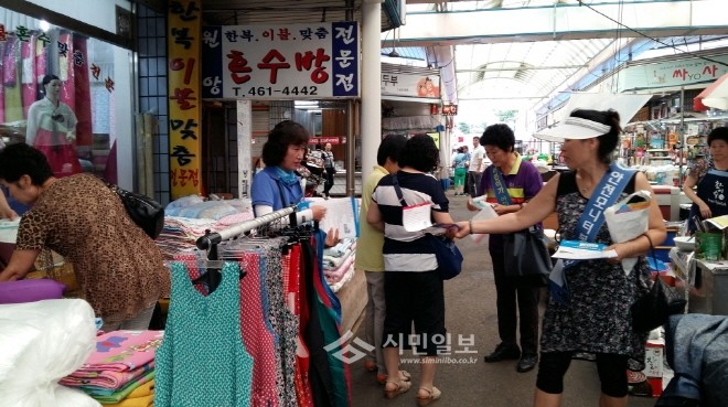 지난 4일 열린 ‘안전점검의 날 캠페인’에 참가한 인천 남동구 만수6동 주민센터, 남동구 지원민방위대, 안전모니터봉사단 등의 참가자들이 장승백이전통시장을 돌며 시장 상인과 방문객들에게 안내문을 배포하고 있다. (사진제공=인천시청)