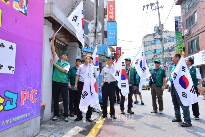 최근 서울 서초구 반포1동에서 새마을지도자협의회 주관으로 실시된 ‘나라사랑 태극기 거리’ 조성 참여자들이 일반주택 지역 일부 구간을 다니며 태극기를 게양하고 있다.(사진제공=서초구청)