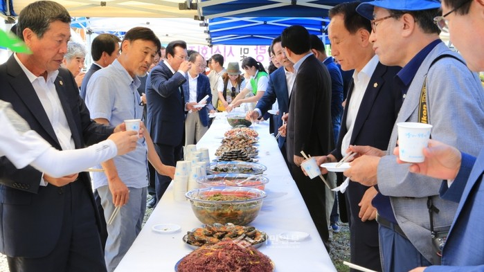 최근 다시마의 최대 주산지인 전남 완도군 금일읍에서 열린 다시마축제에서 참가자들이 다시마를 주제로 만든 여러 가지 요리를 맛보며 이야기를 나누고 있다.(사진제공=완도군청)
