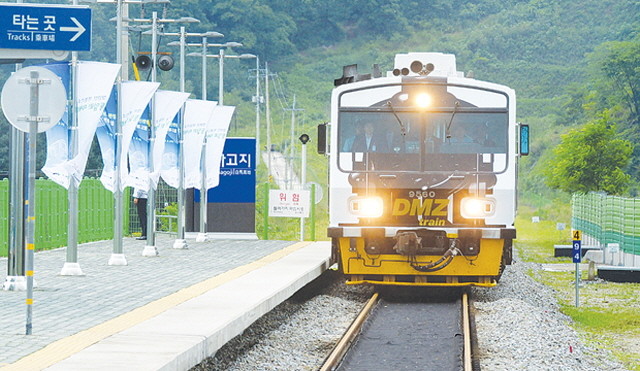 박근혜 대통령이 5일 오전 강원도 철원군 철원읍 백마고지역에서 열린 ‘경원선 남측구간 철도복원 기공식’에 참석, 박근혜 대통령을 태운 경원선 기차가 백마고지역으로 들어오고 있다.
