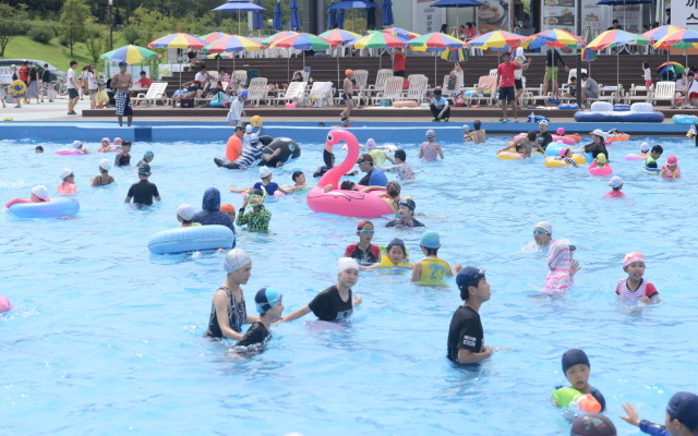 전국적으로 무더위가 이어지는 가운데 5일 오후 서울 여의도한강시민공원 수영장을 찾은 어린이와 시민들이 물장난을 치면서 더위를 식히고 있다.