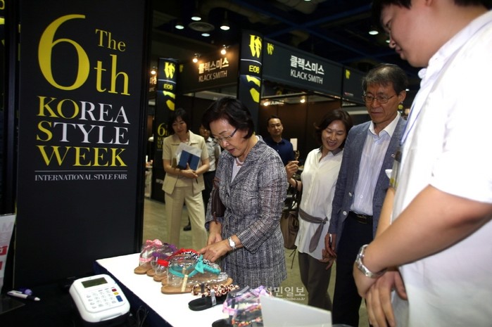 최근 서울 강남구 코엑스에서 열린 '제6회 코리아 스타일 위크' 행사장의 한 참가기업 부스를 방문한 신연희 서울 강남구청장이 관계자들과 함께 진열된 신발들을 살피고 있다.(사진제공=강남구청)