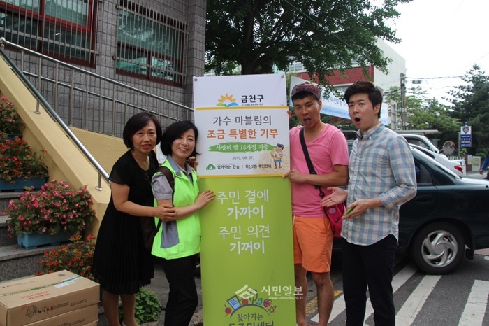 서울 금천구 독산2동 주민센터는 최근 (사)함께하는 한숲과 가수 마블링이 후원하는 사랑의 쌀 전달 행사를 개최했다. 사진은 행사에 참여한 가수 마블링(오른쪽 2명)과 독산2동장(왼쪽 첫 번째)의 모습.(사진제공=금천구청)