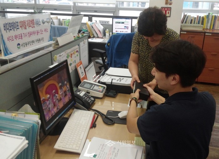 서울 마포구 서강동주민센터가 주민 행정서비스의 일환으로 비디오테이프를 디지털 파일로 변환해주는 사업을 추진 중인 가운데 최근 주민센터를 방문한 주민이 손자의 재롱잔치 영상이 담긴 비디오테이프를 디지털 파일로 변환하는 서비스를 신청하고 있다. (사진제공=마포구청)