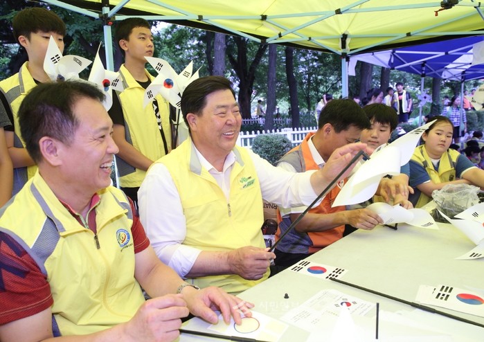 조길형 영등포구청장은 지난 10일 오전 11시 구청 뜨락에서 열린 '광복절 태극기 달기 캠페인'에 참석했다. 사진은 이날 행사에서 조 구청장(가운데)이 참여자들과 함께 태극기 바람개비를 만들며 웃고 있는 모습.(사진제공=영등포구청)