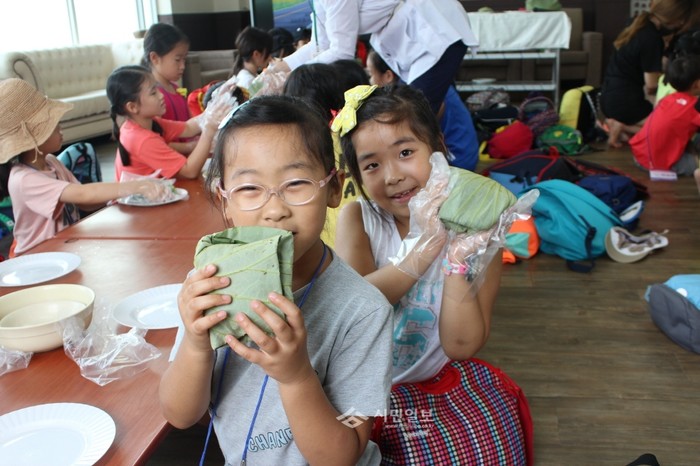 서울 은평구 진관동 주민자치위원회는 최근 경기 양주시 장흥면 '천생연분마을'에서 지역내 초등학생들을 대상으로 농촌체험학습을 실시했다. 사진은 참여 어린이들이 직접 연잎에 밥을 싸는 연잎밥 만들기 체험을 하며 기념촬영한 모습.(사진제공=은평구청)