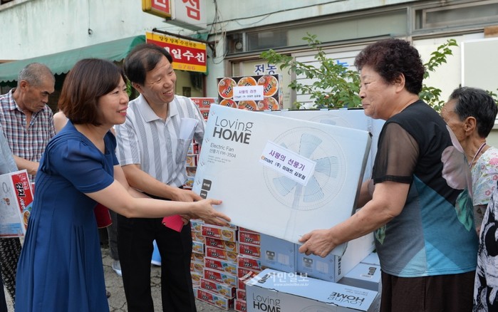 폭염이 절정에 달한 최근 서울 동대문구청 직원들이 이마트 김포점에서 기증한 '사랑의 선풍기'를 쪽방촌 주민에게 전달하고 있다. 이날 이마트 김포점은 지역내 쪽방 거주자들을 위해 선풍기 21대와 컵라면 127개를 기증했다.(사진제공=동대문구청)