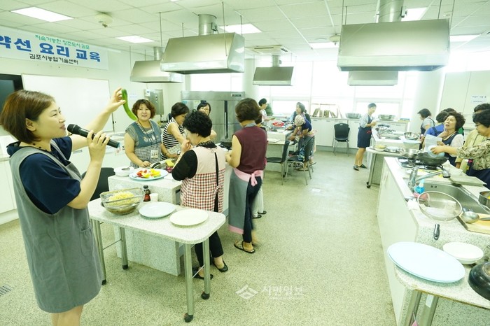경기 김포시농업기술센터는 지난 10일 센터내 생활과학관에서 교육생 30여명이 참석한 가운데 '약선요리교육 개강식'을 진행했다. 사진은 참여 교육생들이 요리 시작 전 강사의 설명을 듣고 있는 모습.(사진제공=김포시청)