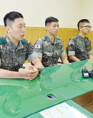 지난 4일 비무장지대(DMZ) 북 지뢰 도발 사고 당시 작전에 참가했던 장병들이 11일 오전 경기도 고양시 덕양구 국군고양병원에서 열린 기자회견에서 당시 상황을 설명하고 있다.