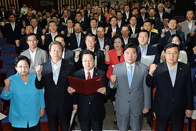 11일 오전 서울 여의도 국회 246호 회의실에서 열린 새누리당 의원총회에서 김무성 대표 및 의원들이 지난4일 오전 경기도 파주시 군사분계선 (MDL) 남쪽 비무장지대에서 북한군의 지뢰도발을 규탄하며 대북 결의문 낭독하고 있다.