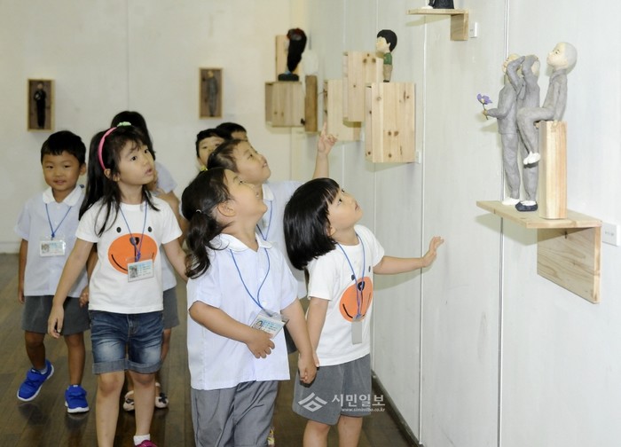 광진구가 운영하는 동화마을창작소에서 오는 22일까지 ‘2015년 하반기 동화마을창작소 전시회’를 개최한다. 사진은 지난 11일 전시회를 방문한 어린이들이 작품을 감상하고 있는 모습.(사진제공=광진구청)