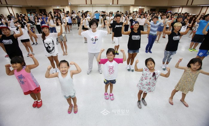 오는 15일 송파구 올림픽로에서 '광복 70주년'을 기념해 개최되는 ‘춤 815’ 행사를 앞두고 지난 11일 박춘희 구청장(2열 가운데)과 시민들이 ‘독립군애국가’에 맞춰 즐겁게 춤 연습을 하고 있다.(사진제공=송파구청)