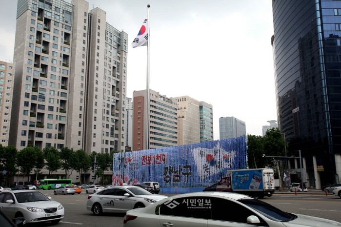 지난 11일 서울 강남구가 광복 70주년을 맞아 태극기 달기 운동의 일환으로 설치한 가로 6m, 높이 3m 규모의 깃봉을 이용해 만든 태극기 조형물과 대형 태극기가 영남대교 남단 교차로에서 휘날리고 있다.(사진제공=강남구청)