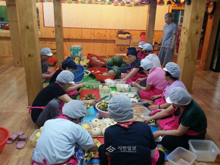 지난 11일 서울 도봉구복지공동체 소속 복지위원들이 민간복지거점기관인 서원암에 모여 말복을 맞아 지역내 거동불편 노인 300가구에 전달할 화채를 만들고 있다. (사진제공=도봉구청)