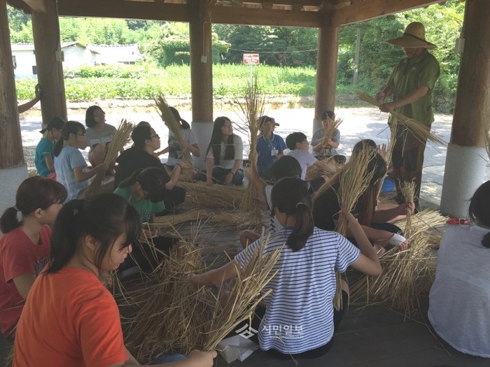 전남 나주시 나주중학교는 최근 문평면 명하쪽빛마을에서 교육복지우선지원사업 학교 학생 30명을 대상으로 '비단고을 탐험대-달팽이 학교' 캠프를 진행했다. 사진은 캠프에 참여한 학생들이 볏짚을 꼬며 띠배를 만들고 있는 모습.(사진제공=전라남도교육청)