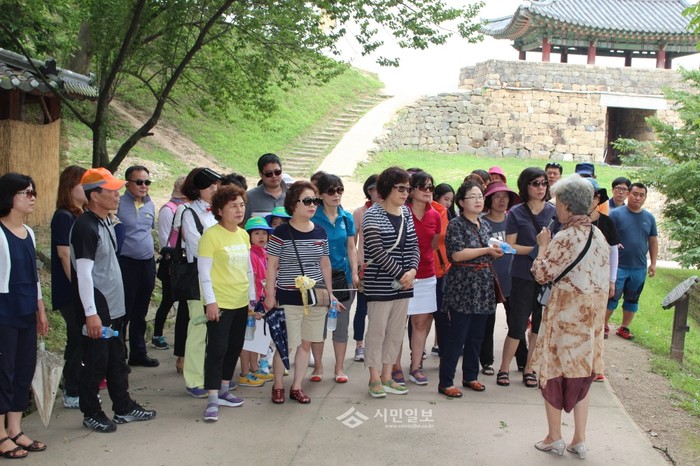 충남 아산교육지원청은 최근 여름방학을 맞아 학교 일선에서 학생들의 식품 안전과 통학차량 운행에 힘쓰는 조리사와 운전원들을 대상으로 ‘2015년 조리운전 직렬 대상 직무연수’를 실시했다. 사진은 연수 참여자들이 유적지를 돌아보며 역사문화 탐방을 진행 중인 모습.(사진제공=아산교육지원청)