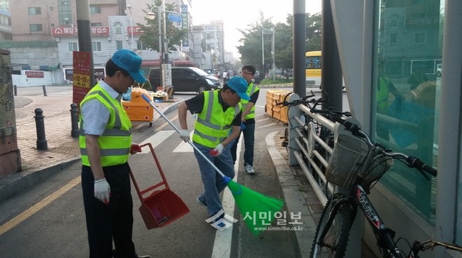제종길 경기 안산시장(가운데)이 최근 안산역 일원에서 시민과 함께 환경미화원 체험에 나서 빗자루를 들고 환경미화원들과 함께 거리 청소를 하고 있다.(사진제공=안산시청)